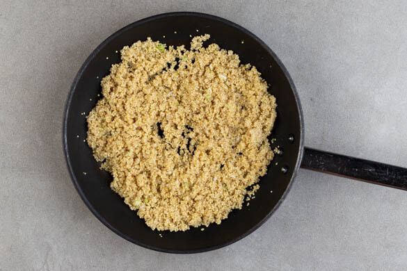 Die Quinoa in einem feinmaschigen Sieb mit warmem Wasser abspülen, in das kochende Wasser im kleinen Topf geben und 18–20Min. abgedeckt bei niedriger bis mittlerer Hitze sanft köcheln lassen. Anschließend vom Herd nehmen.