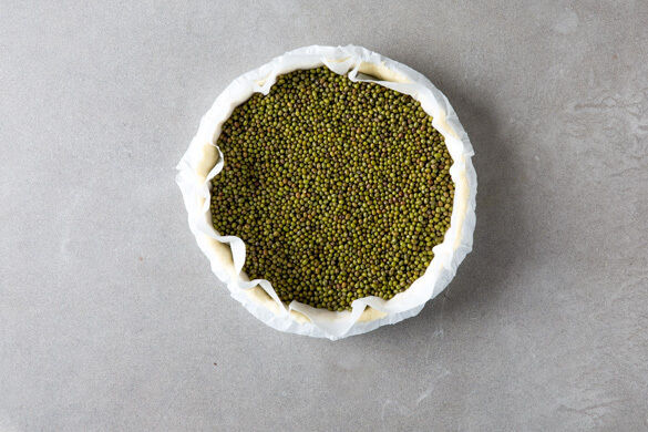 Den Backofen auf 200°C (180°C Umluft) vorheizen. Den Blätterteig in eine ca. 20cm große, runde Quicheform ausrollen, überschüssigen Teig ggf. wegschneiden. Vorhandene Lücken mit den Teigstücken füllen und die Teigränder zusammendrücken. Mit Backpapier und Reis oder trockenen Hülsenfrüchten als Backgewicht bedecken und 10–15Min. im Ofen vorbacken.