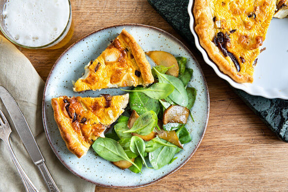 Heute kredenzt du deinen Liebsten ganz was Feines: In der luftigen Blätterteig-Quiche versteckst du geschmackvoll karamellisierte Zwiebeln und milden Ziegenkäse. Und auch die Beilage hat es ganz schön in sich, denn der frische Spinatsalat mit leckerer Vinaigrette lässt sich zur Feier des Tages nicht lumpen und beschert dir mit den noch warmen gebratenen Birnen ein köstliches Geschmackserlebnis. Man gönnt sich ja sonst nix!