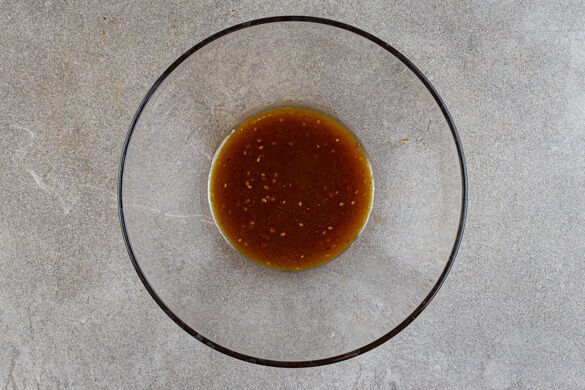 In einem mittelgroßen Topf ausreichend gesalzenes Wasser für die Nudeln zum Kochen bringen. Das Soja-Sesam-Dressing mit 1EL Pflanzenöl, 2EL Essig, 1EL Wasser und 1 kräftigen Prise Salz verrühren.