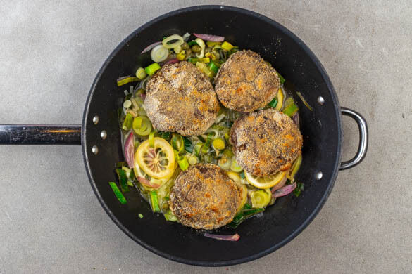 1½EL Butter in einer mittelgroßen Pfanne schmelzen, dann die Schalotten, den Lauch und die restlichen Zitronenscheiben zugeben und unter gelegentlichem Rühren 2–3Min. duftend anbraten. Die ½ des Brühgewürzes und 90ml Wasser unterrühren und 3–5Min. köcheln lassen, bis die Brühe um die Hälfte reduziert ist.