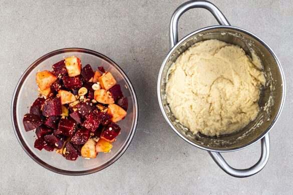 Die Rote Bete abgießen und mit den Äpfeln und den Haselnüssen zu einem Salat vermengen. Den Sellerie und 2–3EL Kochwasser mit einem Stabmixer cremig pürieren, dabei ggf. löffelweise mehr Kochwasser zufügen. Das Püree mit Salz und Pfeffer abschmecken, dann mit dem Steak und ggf. übrig gebliebener Glasur auf Teller verteilen und mit dem Salat servieren.