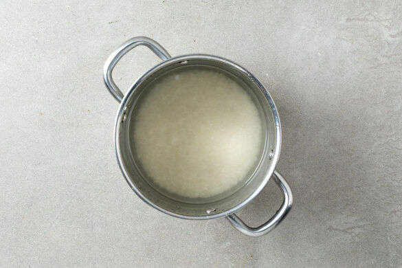 In einem mittelgroßen Topf 600ml leicht gesalzenes Wasser zum Kochen bringen. Den Reis in einem Sieb kalt abspülen, bis das Wasser klar bleibt. Sobald das Wasser kocht, den Reis hineingeben und abgedeckt bei niedrigster Hitze 18–20Min. kochen, bis das Wasser aufgesogen und der Reis gar ist. Noch ca. 5Min. ohne Hitzezufuhr ziehen lassen.
