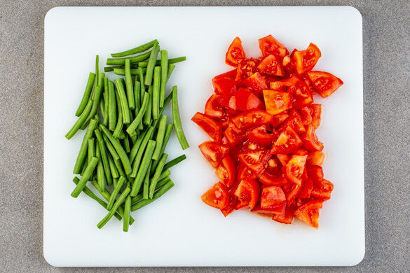 In einem mittelgroßen Topf ausreichend gesalzenes Wasser für die Pasta zum Kochen bringen. Die Tomaten in ca. 2cm große Stücke schneiden. Die Bohnen halbieren, dabei die Enden entfernen.