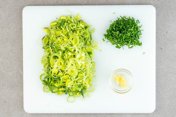 Den Lauch längs halbieren, dann quer in dünne Scheiben schneiden. Den Knoblauch schälen und durch eine Knoblauchpresse drücken oder fein reiben. Die Petersilie fein hacken.