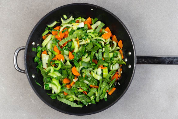 Den Knoblauch in einer mittelgroßen Pfanne mit 1EL Pflanzenöl bei mittlerer Hitze ca. 30Sek. anbraten. Die weißen Pak-Choi-Streifen, die Karotten und die weißen Lauchzwiebelringe dazugeben und 6–8Min. anbraten.
