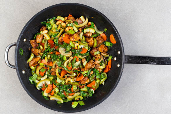 Dieses Gericht ist ein echter Klassiker der Thai-Küche! Zartes Hähnchenkeulenfleisch, knackiges Gemüse und extra viele Cashewkerne in Kombination mit einer süß-säuerlichen Sauce und einem Hauch Schärfe lassen uns von der nächsten großen Reise träumen!