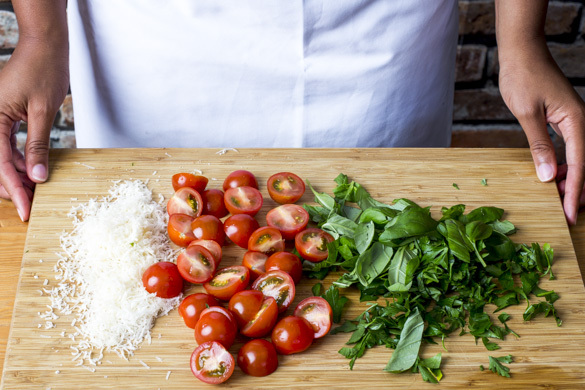Währenddessen die Kirschtomaten halbieren. Das Basilikum und die Petersilie samt Stängeln grob schneiden. Den Käse fein reiben.