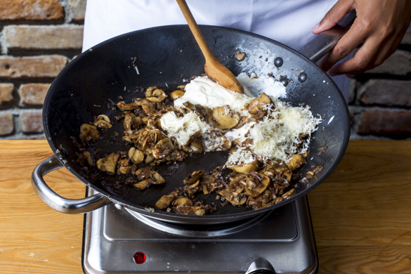 Die Pilze mit 100ml Balsamicoessig ablöschen, dann die Hitze reduzieren und den Essig 2–3Min. einköcheln lassen. Den Käse und die Sahne unterrühren.