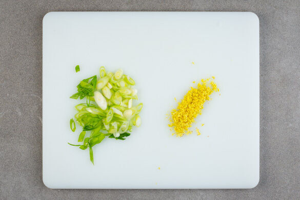 Die Lauchzwiebeln in feine Ringe schneiden. Den Ingwer schälen und fein reiben.