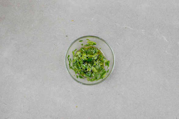 Die Petersilie samt Stängeln grob hacken. 1EL Petersilie mit 1EL Olivenöl, 1EL Essig und 1EL Wasser zu einer Vinaigrette verrühren und mit Salz und Pfeffer abschmecken.