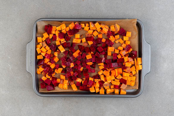 Das Gemüse auf einem mit Backpapier ausgelegten Backblech mit 1EL Olivenöl und je ½TL Salz und Pfeffer vermengen und 25–30Min. im Ofen backen, bis die Süßkartoffeln weich und die Rote-Bete-Würfel bissfest sind.
