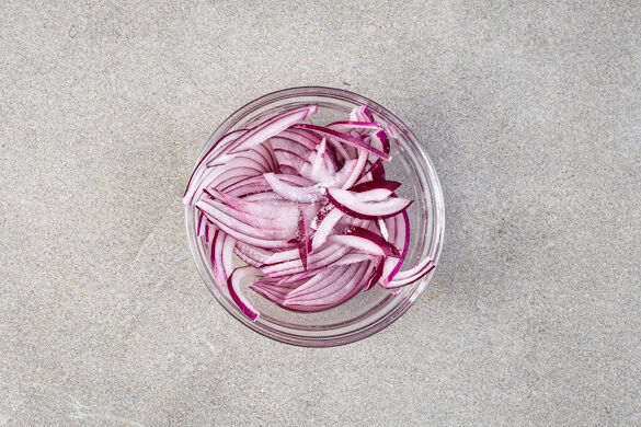 Den Backofen auf 220°C (200°C Umluft) vorheizen. Die Zwiebel schälen, halbieren und in feine Streifen schneiden. ⅔ der Zwiebeln mit 1EL Essig und je 1 Prise Zucker und Salz vermengen und beiseitestellen.