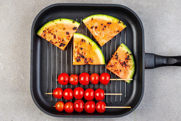 Die Melone auf dem Grill oder in der Grillpfanne von jeder Seite 2–3Min. grillen. Die Tomatenspieße insgesamt 5–6Min. grillen, dabei gelegentlich wenden. Die Melone und die Spieße sind fertig, wenn deutliche Grillstreifen zu sehen sind. Zurück auf das Blech geben, um austretende Säfte aufzufangen. Ggf. mit Alufolie abdecken, wenn in mehreren Durchgängen gearbeitet werden muss.