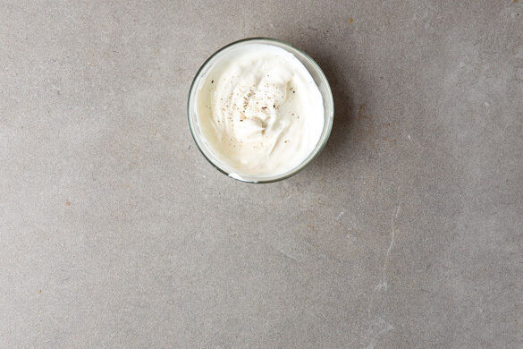 Den Knoblauch schälen und sehr fein würfeln oder durch eine Knoblauchpresse drücken. Den Joghurt mit dem Knoblauch und ½TL Salz verrühren. Wer eine Grillpfanne verwendet, sollte sie nun mittelhoch erhitzen.