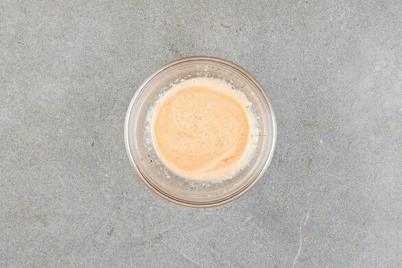 Die Sriracha-Sauce mit 4EL Mayonnaise, 2EL Wasser und 1 Prise Salz verrühren. Tipp: Wenn Kinder mitessen, die Sriracha-Sauce weglassen und später separat dazureichen.
