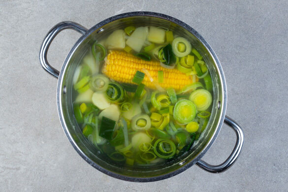 In einem mittelgroßen Topf reichlich gesalzenes Wasser zum Kochen bringen. Die Kartoffeln schälen und in 3–4cm große Stücke schneiden. Den Mais schälen, in das kochende Wasser geben und ca. 20Min. kochen. Nach ca. 8Min. die Kartoffeln und die ½ des Lauchs zugeben und mitkochen. Den Mais herausnehmen, dann das Gemüse in ein Sieb abgießen und im Topf abgedeckt warm halten.