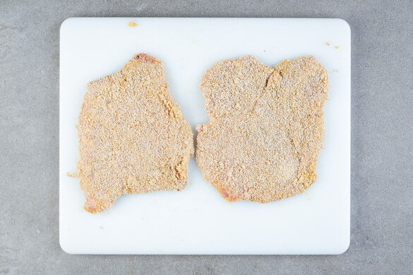 Auf einem tiefen Teller 50g Mehl mit 1 Prise Pfeffer verrühren. Auf einem zweiten Teller 1 Ei mit der ½ der Gewürzmischung verquirlen. Auf einem dritten Teller die Semmelbrösel bereitstellen. Das Fleisch nacheinander im Mehl, dem verquirlten Ei und den Semmelbröseln wenden.