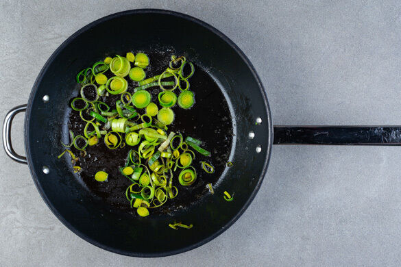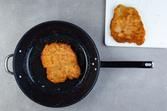 Eine mittelgroße Pfanne mit einer ca. 0,5cm hohen Schicht Pflanzenöl bei mittlerer bis starker Hitze erwärmen. Die Schnitzel in das heiße Öl geben und auf jeder Seite ca. 4Min. goldbraun braten. Die Schnitzel auf etwas Küchenkrepp abtropfen lassen und die Pfanne auswischen.