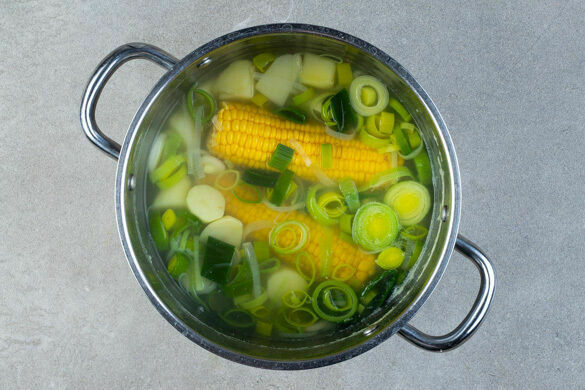 In einem großen Topf reichlich gesalzenes Wasser zum Kochen bringen. Die Kartoffeln schälen und in 3–4cm große Stücke schneiden. Den Mais schälen, in das kochende Wasser geben und ca. 20Min. kochen. Nach ca. 8Min. die Kartoffeln und die ½ des Lauchs zugeben und mitkochen. Den Mais herausnehmen, dann das Gemüse in ein Sieb abgießen und im Topf abgedeckt warm halten.