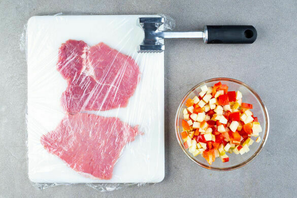 Die Paprika und die Äpfel jeweils vierteln, entkernen und in ca. 0,5cm kleine Würfel schneiden. Die Zitrone halbieren und auspressen. Die Paprika- und die Apfelwürfel mit 2–3EL Zitronensaft, 2TL Zucker und ½TL Salz vermengen und beiseitestellen. Das Fleisch trocken tupfen und zwischen Frischhaltefolie ca. 0,5cm dünn plattieren.
