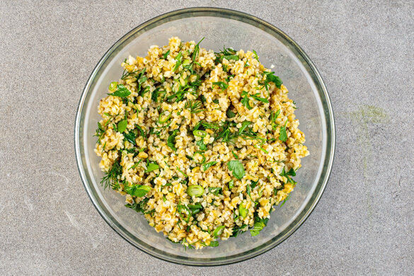 Die Minzeblätter von den Stängeln zupfen und fein schneiden. Den Dill samt Stängeln ebenfalls fein schneiden. Die Lauchzwiebeln in dünne Ringe schneiden. Die Kräuter, die Lauchzwiebeln, 2EL Olivenöl, 2EL Essig sowie je 1TL Salz und Pfeffer unter den fertigen Bulgur rühren.