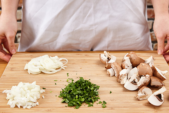 In einem mittelgroßen Topf ausreichend leicht gesalzenes Wasser für die Kartoffeln zum Kochen bringen. Die Pilze ggf. säubern und vierteln. Die Zwiebel schälen, halbieren und eine Hälfte in Würfel, die andere Hälfte in dünne Streifen schneiden. Die Petersilie samt Stängeln fein hacken.