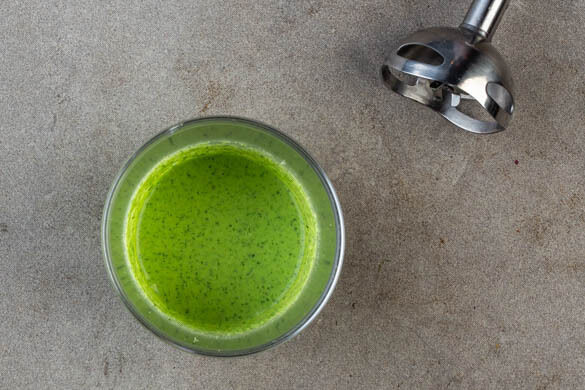 Die Mandeln, die Kräuter und den Knoblauch in einem hohen Gefäß mit der Crème fraîche und 2EL Olivenöl zu einem cremigen Pesto pürieren. Mit Salz und Pfeffer abschmecken.