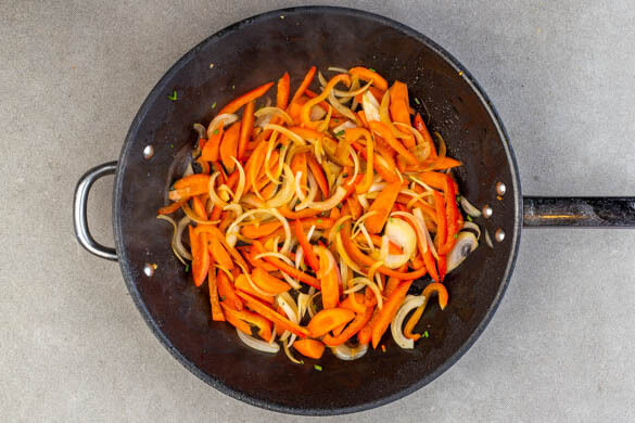 Die Zwiebeln, die Karotten, die Paprika und die Korianderstängel mit 1 kräftigen Prise Salz und 1EL Pflanzenöl in den Wok oder die Pfanne geben und 4–5Min. braten, bis das Gemüse bissfest ist.