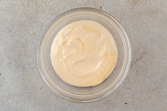 2EL Mayonnaise mit der restlichen Hoisinsauce und 1TL Essig zu einem Dip verrühren. Mit Salz und Pfeffer abschmecken.