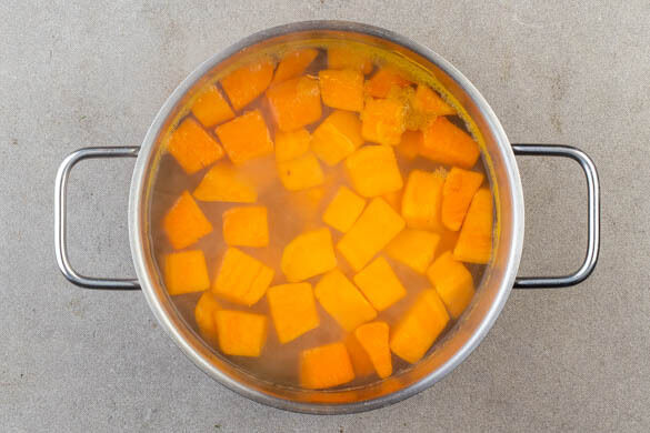 In einem mittelgroßen Topf ausreichend gesalzenes Wasser für die Süßkartoffel zum Kochen bringen. Die Süßkartoffel schälen, grob würfeln, in das kochende Wasser geben und in 10–12Min. gar kochen. Die Chorizos in ca. 1,5cm große Stücke schneiden. Den Blumenkohl nach 10Min. Backzeit wenden und die Chorizos darüberstreuen. Mit ½EL Olivenöl beträufeln und 10–15Min. weiter backen.