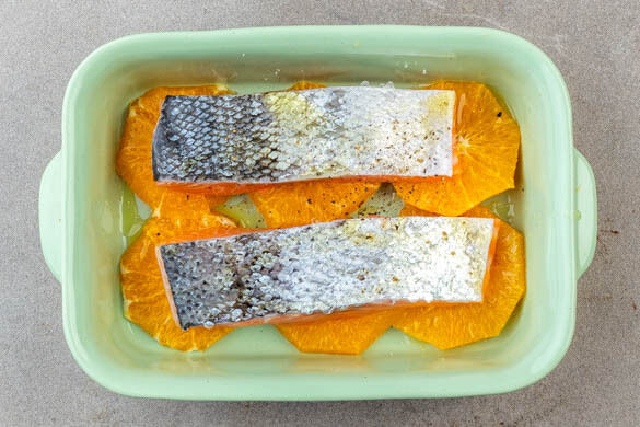 Den Backofen auf 135°C (115°C Umluft) vorheizen. Die Schale von 1 Orange fein abreiben. Alle Orangen schälen und in ca. 0,5cm dicke Scheiben schneiden. Die ½ der Orangenscheiben in eine Auflaufform legen. Den Fisch trocken tupfen, mit je 1 kräftigen Prise Salz und Pfeffer und 2EL Olivenöl einreiben und mit der Hautseite nach oben auf die Orangen legen. 35–40Min. im Ofen backen.