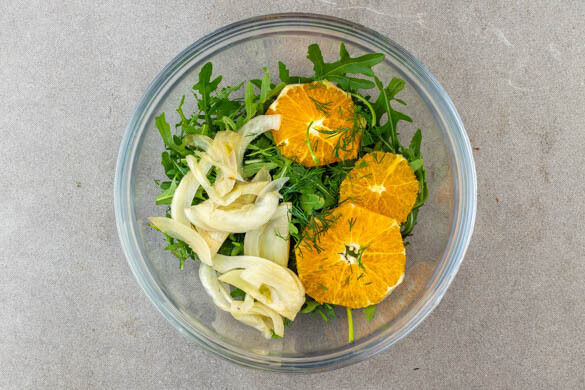 dazu Crushed Potatoes & Fenchel-Orangen-Salat