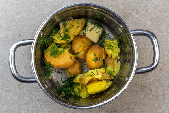 Den Dill grob schneiden. Die Kartoffeln auf ein Schneidebrett geben und mit dem Boden des Topfes leicht zerdrücken. Dann zurück in den Topf geben und 2EL kalte Butter sowie die ½ des Dills untermengen.
