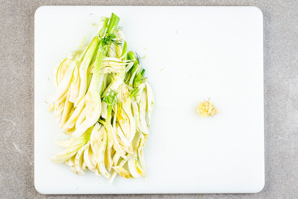 In einem mittelgroßen Topf ausreichend gesalzenes Wasser für die Pasta zum Kochen bringen. Den Fenchel längs halbieren, dabei den harten Strunk und die Stängel entfernen und den Fenchel in feine Streifen schneiden. Den Knoblauch schälen und fein würfeln.