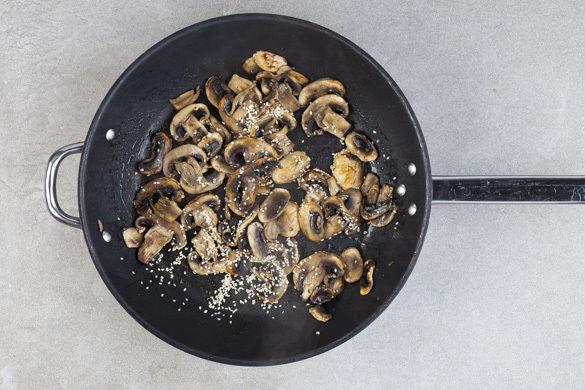 Die Pilze in der Pfanne oder dem Wok mit 1EL Pflanzenöl bei starker Hitze 3–4Min. scharf anbraten. Den restlichen Sesam untermischen und ca. 1Min. mitbraten. Mit Salz und Pfeffer würzen, aus der Pfanne nehmen und warm stellen.