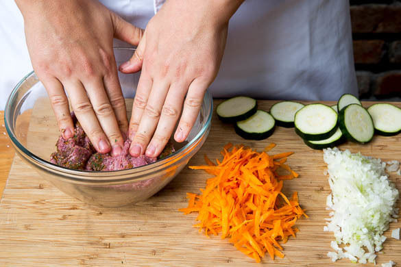 Die Zwiebeln schälen, halbieren und fein würfeln. Das Hackfleisch mit der 1/2 der Zwiebeln und der Gewürzmischung verkneten. Aus der Masse ca. 20 längliche Kebabs formen. Die Karotten ggf. schälen und grob raspeln. Die Zucchini in ca. 1cm dicke Scheiben schneiden und mit 1EL Olivenöl sowie je 1 kräftigen Prise Salz und Pfeffer würzen.