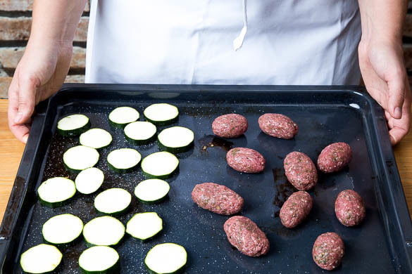 Die Kebabs und die Zucchinischeiben auf zwei Backblechen verteilen und im oberen und mittleren Teil des Ofens in 8–10Min. gar grillen. Nach der Hälfte der Zeit die Position der Bleche tauschen.