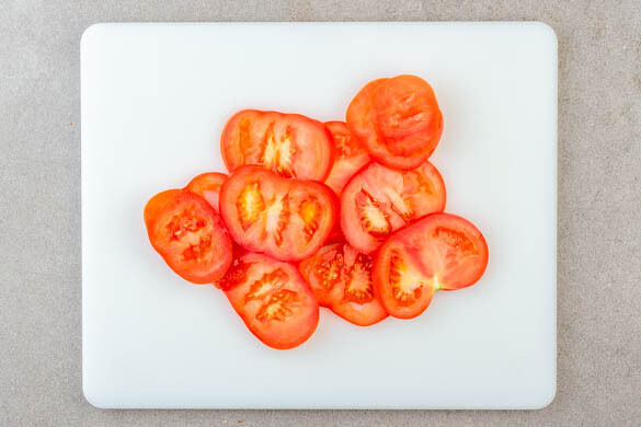 Die Tomate in ca. 0,5cm dünne Scheiben schneiden.
