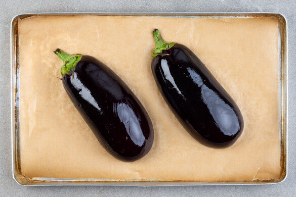Die Auberginen längs halbieren, mit den Schnittflächen nach unten auf ein mit Backpapier ausgelegtes Backblech geben und ca. 10Min. im Ofen grillen, bis die Haut sehr dunkel ist und das Auberginenfruchtfleisch weich ist.