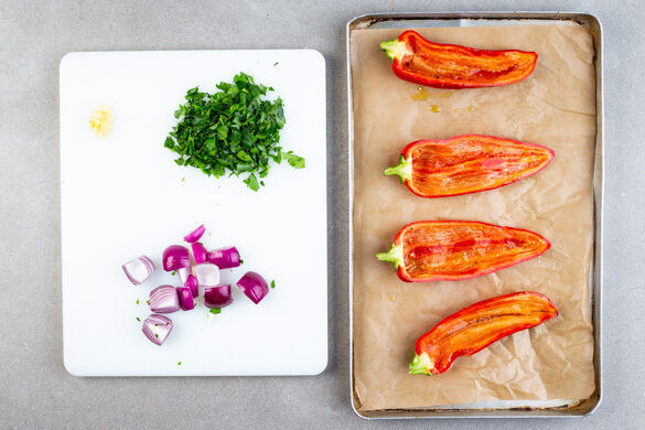 Die Petersilie samt Stängeln fein schneiden. Die Zwiebeln schälen, vierteln und die einzelnen Schichten voneinander lösen. Den Knoblauch schälen und fein würfeln. Die Paprika vierteln und entkernen. Die Auberginen vom Blech nehmen und die Paprikaviertel mit der Hautseite nach unten auf das Blech geben. Mit 1EL Olivenöl beträufeln und mit 1–2 Prisen Salz würzen.