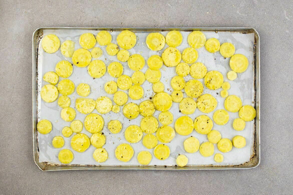 Den Backofen auf 240°C (220°C Umluft) vorheizen. Die gelben Beten schälen und in dünne Scheiben schneiden. Auf einem mit Backpapier ausgelegten Backblech mit 1EL Olivenöl und je 1 Prise Salz und Pfeffer vermengen, gleichmäßig verteilen und in 15–20Min. im Ofen goldbraun backen.