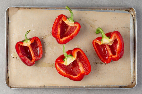 Die Paprika längs halbieren, entkernen und auf ein mit Backpapier ausgelegtes Backblech legen. Die Paprika mit 2TL Olivenöl bepinseln und mit 1 kräftigen Prise Salz würzen, dann unter den Kichererbsen 10–15Min. im Ofen backen.