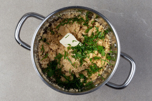 In einem kleinen Topf 300ml Wasser mit der ½ des Brühgewürzes zum Kochen bringen. Den Bulgur in das kochende Wasser rühren und abgedeckt bei niedriger Hitze 5–7Min. sanft köcheln lassen, bis das Wasser aufgesaugt und der Bulgur gar ist. Noch ca. 5Min. ohne Hitzezufuhr ziehen lassen.