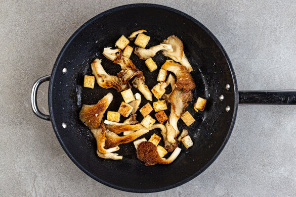 3EL Pflanzenöl in einer großen Pfanne oder einem Wok bei mittlerer bis starker Hitze erwärmen. Den Tofu und die Austernpilze in die Pfanne geben und 6–8Min. braten, dabei nur wenig umrühren, damit sie schön knusprig werden. Tipp: Wer möchte, kann auch 2 Pfannen verwenden oder den Tofu und die Pilze portionsweise braten.