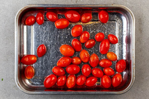 Die Tomaten in einer mittelgroßen Auflaufform mit 2EL Olivenöl und je 1 kräftigen Prise Salz und Pfeffer vermengen. Die Kartoffeln auf der mittleren und unteren Schiene und die Tomaten auf der oberen Schiene ca. 15Min. im Ofen backen.