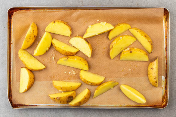 Den Backofen auf 220°C (200°C Umluft) vorheizen. Die Kartoffeln samt Schale in ca. 2cm breite Spalten schneiden und auf ein mit Backpapier ausgelegtes Backblech geben. Den Knoblauch schälen und sehr fein würfeln oder durch eine Knoblauchpresse drücken. Die Kartoffeln mit 1EL Olivenöl, der ½ des Knoblauchs und je 1 kräftigen Prise Salz und Pfeffer vermengen.