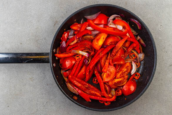 Die Chorizo aus der Pfanne nehmen. Das Gemüse und die Gewürzmischung in der Pfanne mit 2EL Olivenöl bei mittlerer Hitze unter regelmäßigem Wenden ca. 5Min. braten, bis die Zwiebeln weich und glänzend sind.