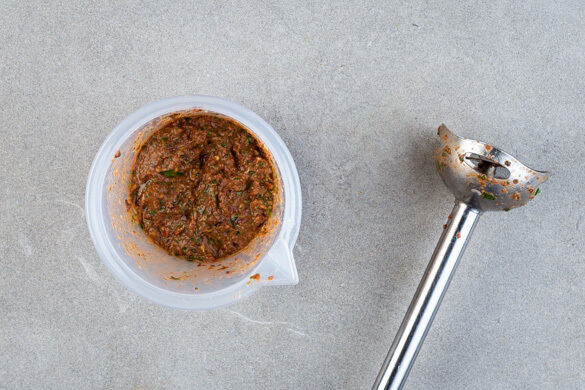 Den Knoblauch schälen und grob würfeln. 1 Tomate vierteln. Die ½ der Petersilie samt Stängeln grob schneiden. Die Oliven, den Knoblauch und 1 Tomatenviertel mit der Petersilie, 1EL Oregano, 1EL Olivenöl und je 1 Prise Salz und Pfeffer in einem hohen Gefäß mit einem Stabmixer pürieren.