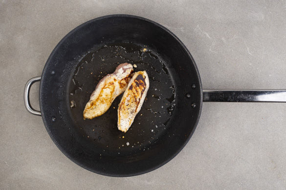 Das Fleisch mit etwas Küchenkrepp trocken tupfen, der Länge nach halbieren und in einer mittelgroßen Pfanne mit 1EL Olivenöl bei mittlerer Hitze auf jeder Seite 1–2Min. goldbraun anbraten. Mit Salz und Pfeffer würzen.